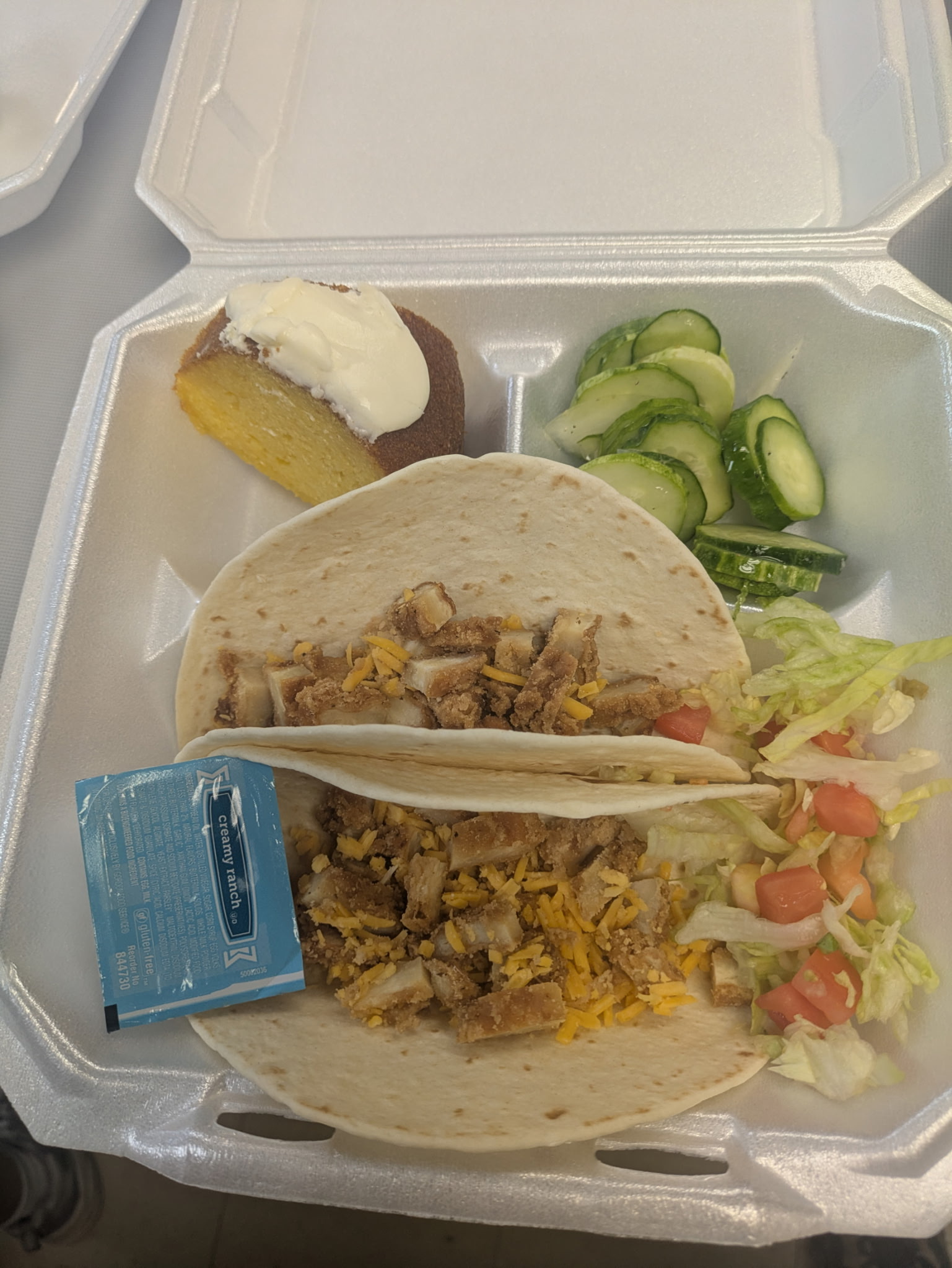 Chicken tacos with cheese, applesauce or pears, cookie and a drink.
