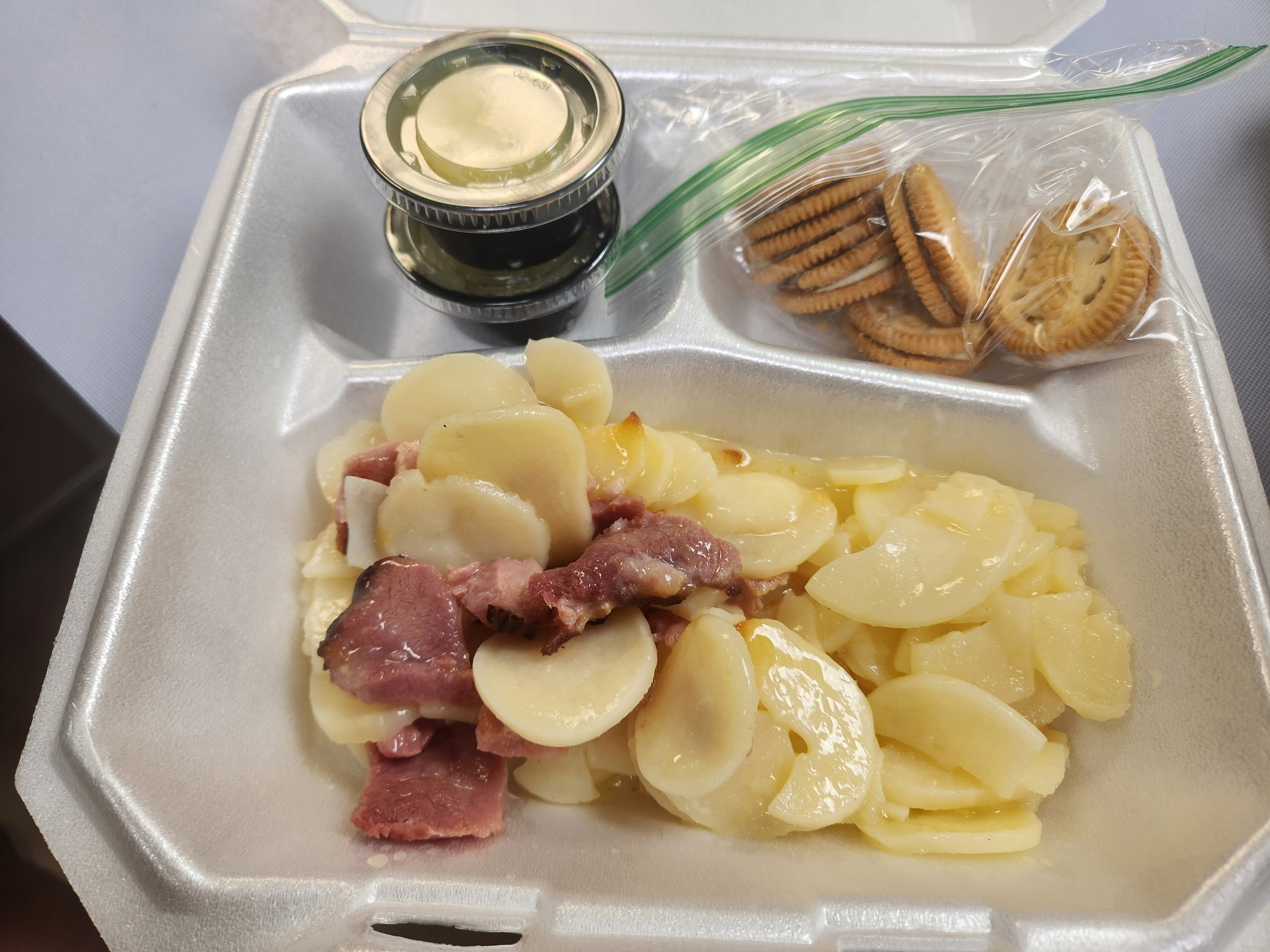 Scalloped potatoes with ham and pork, applesauce and cupcake
