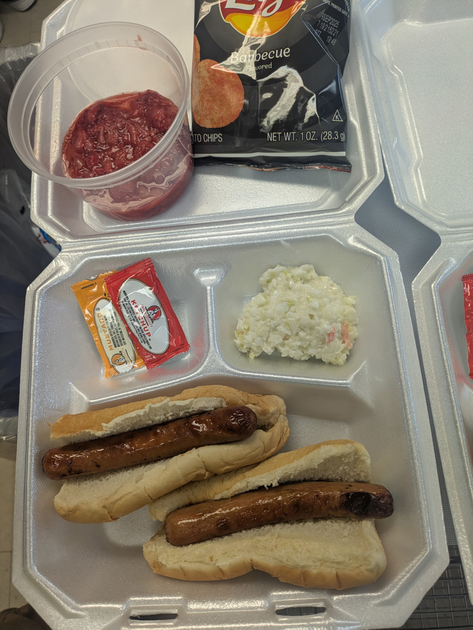 Hot Dogs with Bun, Cole Slaw, Fruit Cocktail, Potato Chips, Brownie with Fruit Punch