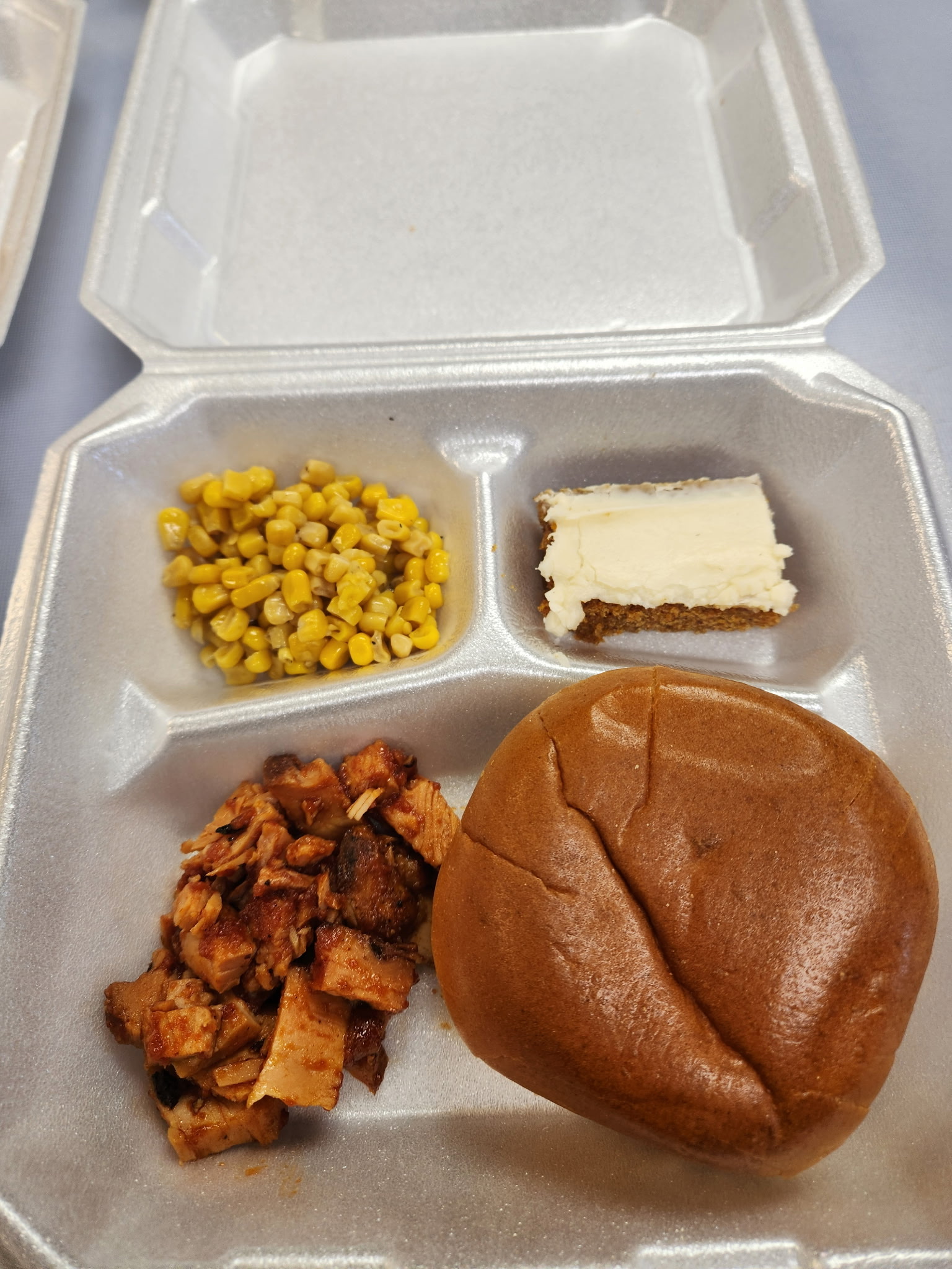 BBQ chicken, baked beans, coleslaw, roll and dessert