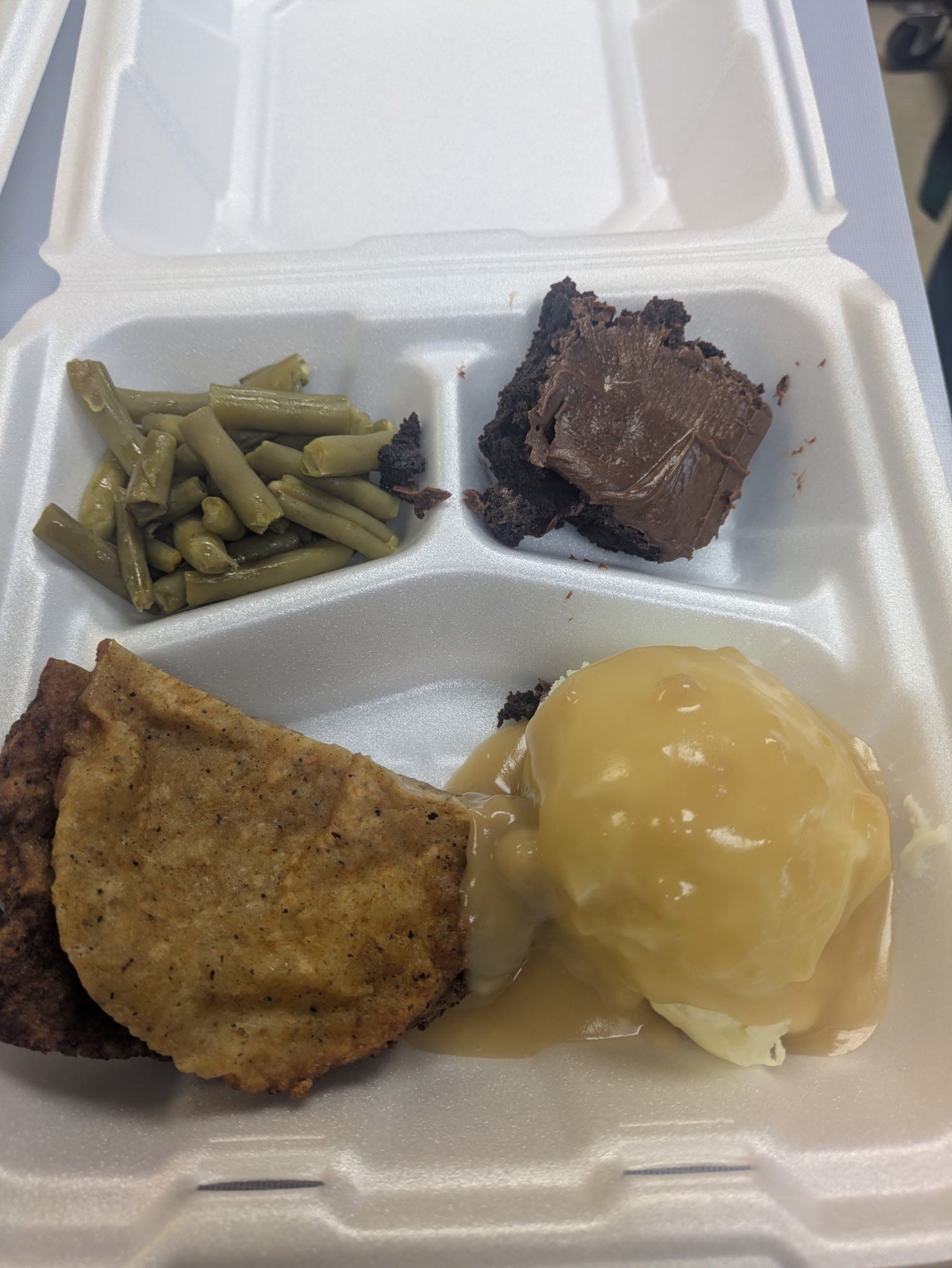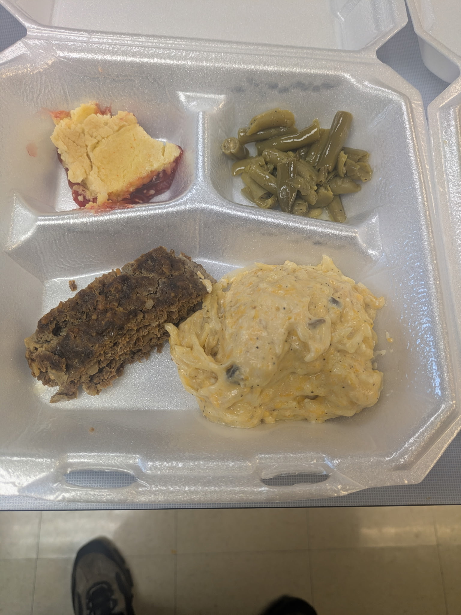 Meatloaf, mashed potatoes and gravy, green beans w/bacon, homemade cake