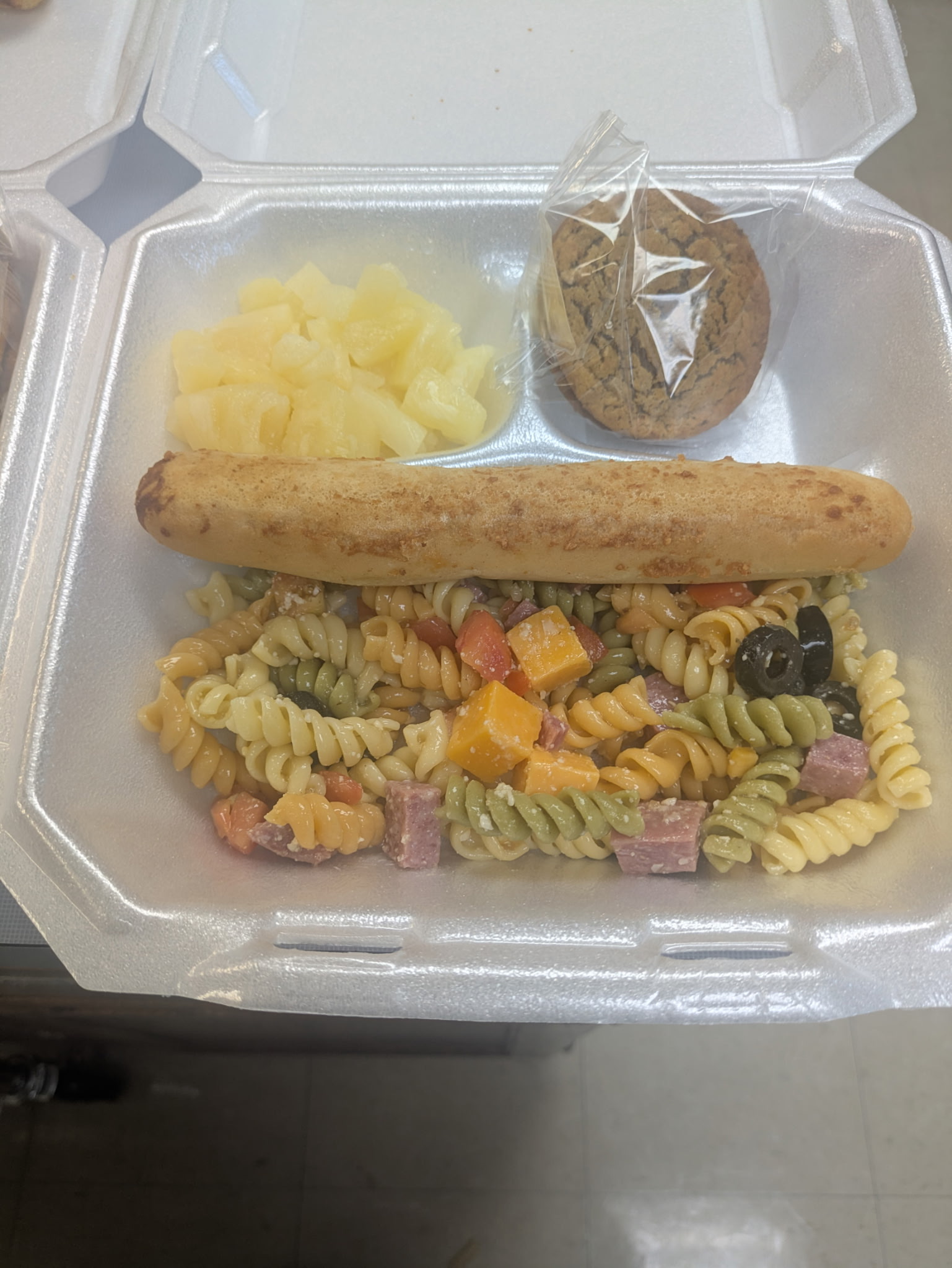 Pasta salad with salami, bread stick, pineapple and oatmeal cookie