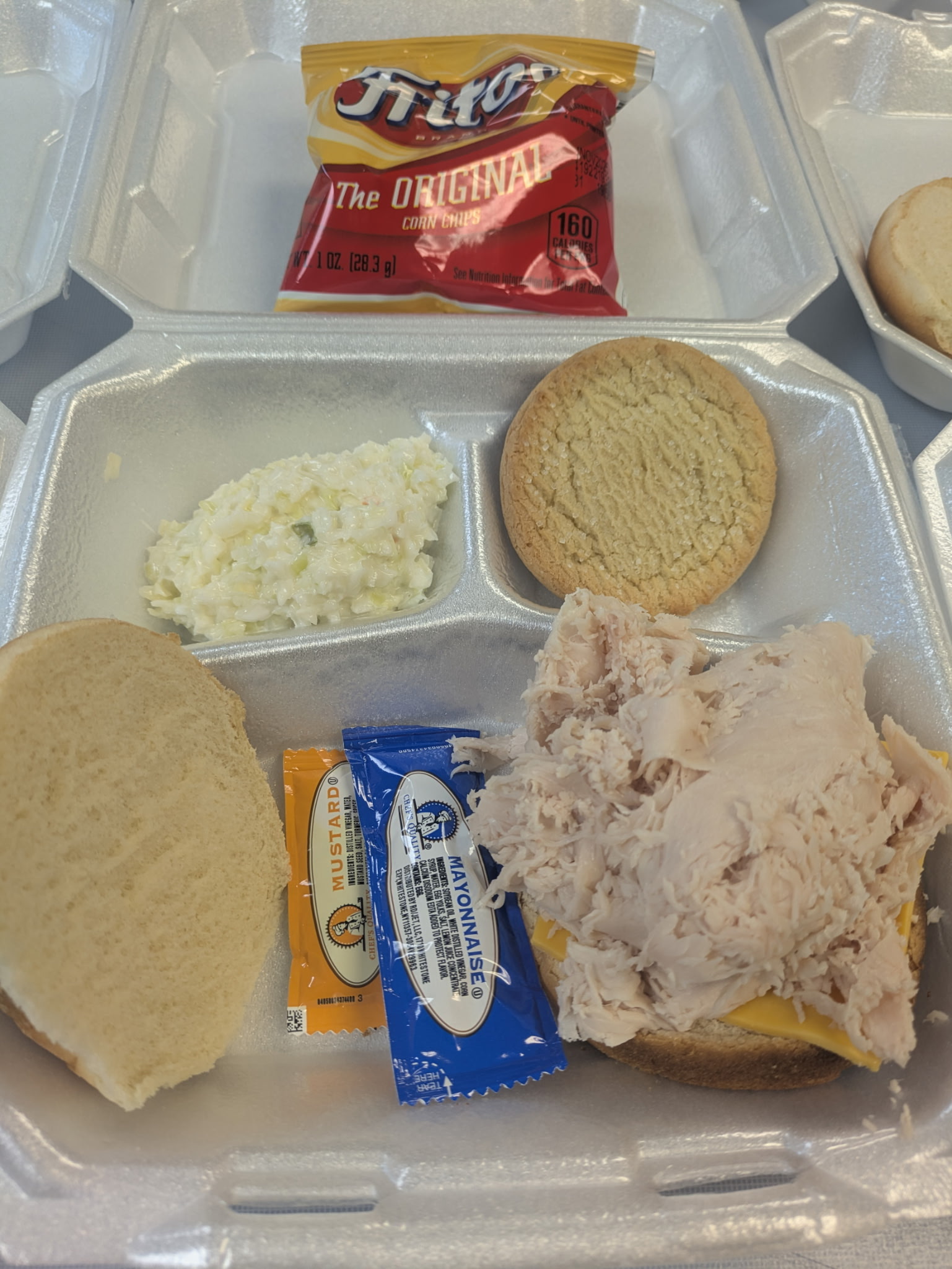 Turkey with cheese sandwich, mayo and mustard, Cole slaw, cookies and Fritos