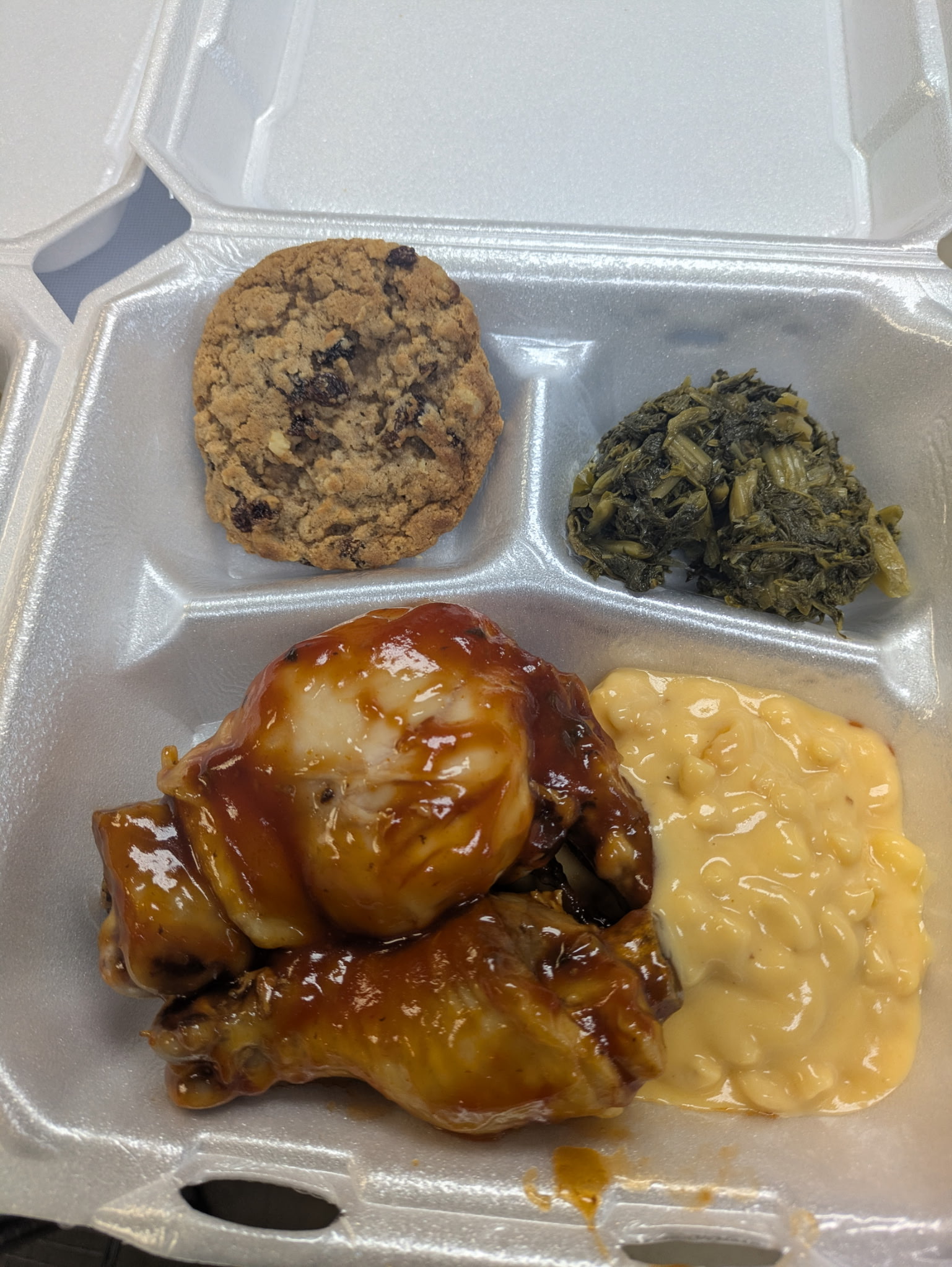 BBQ chicken, mac and cheese, collard greens, and cookie