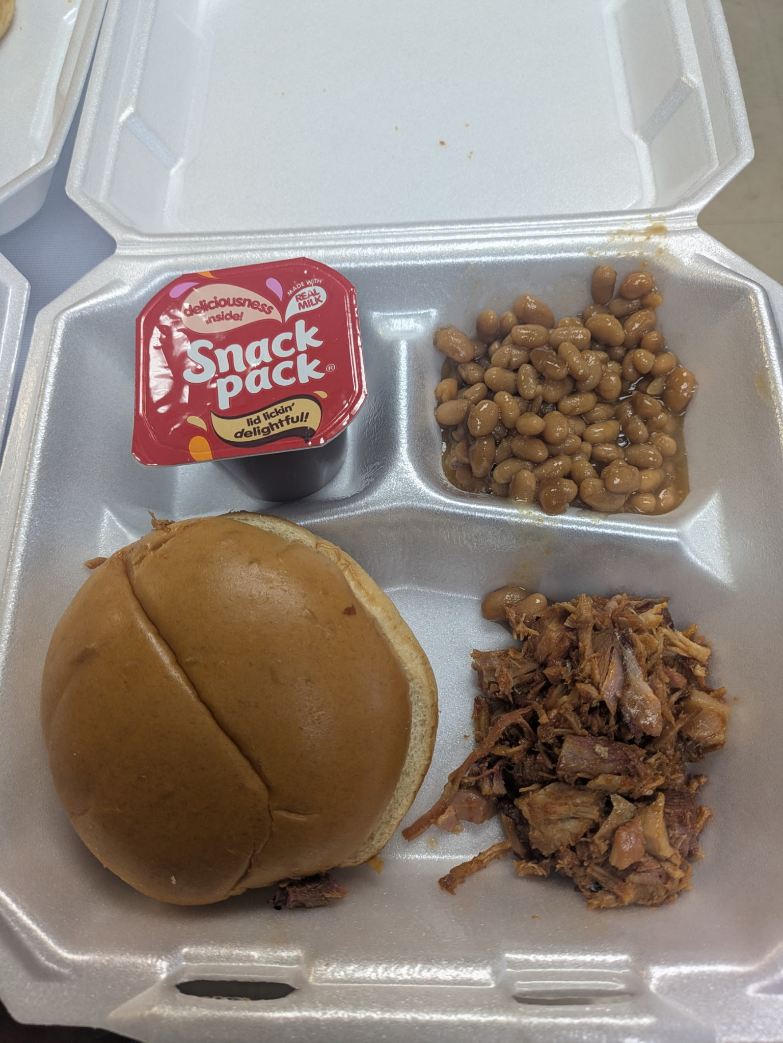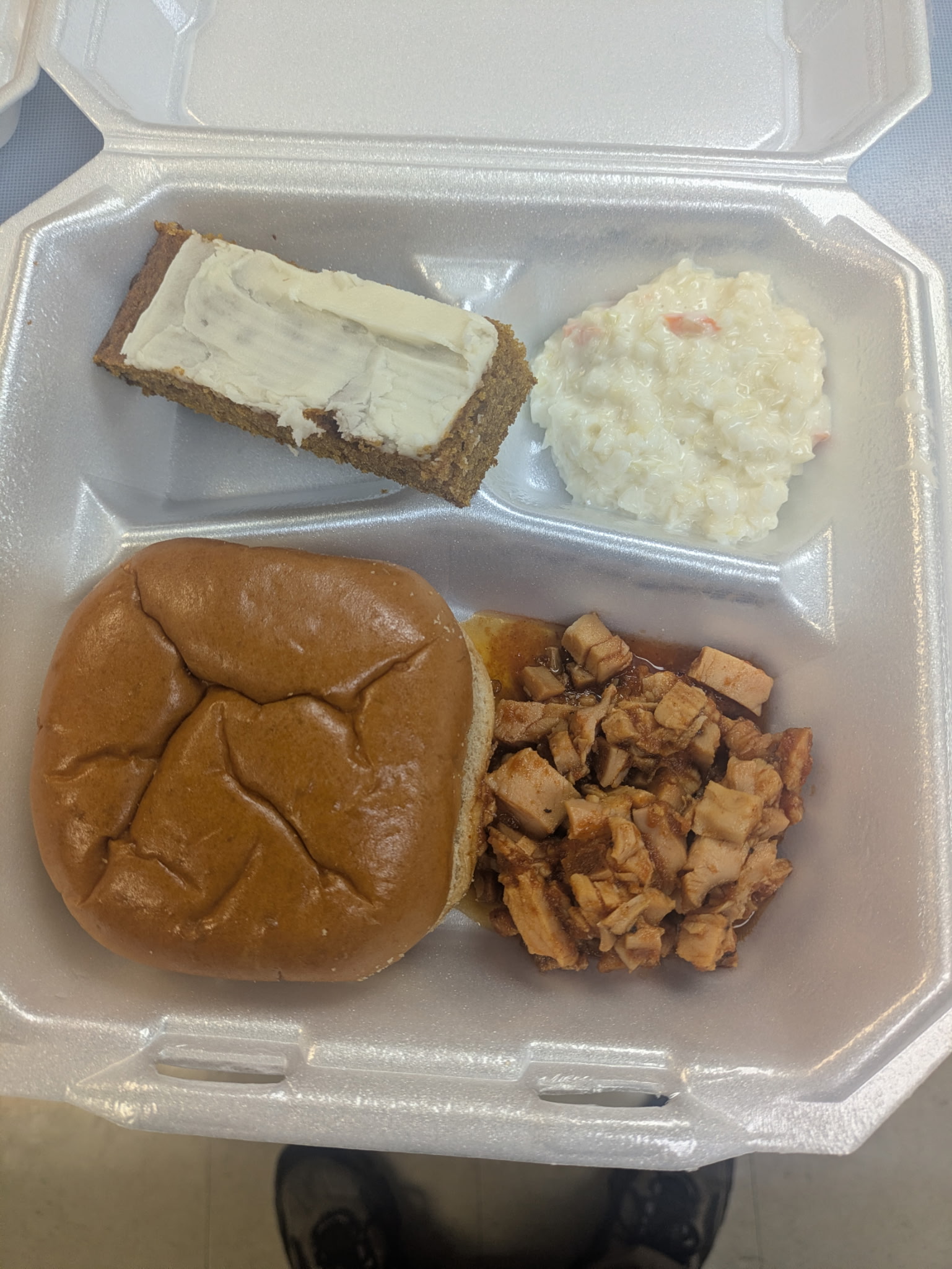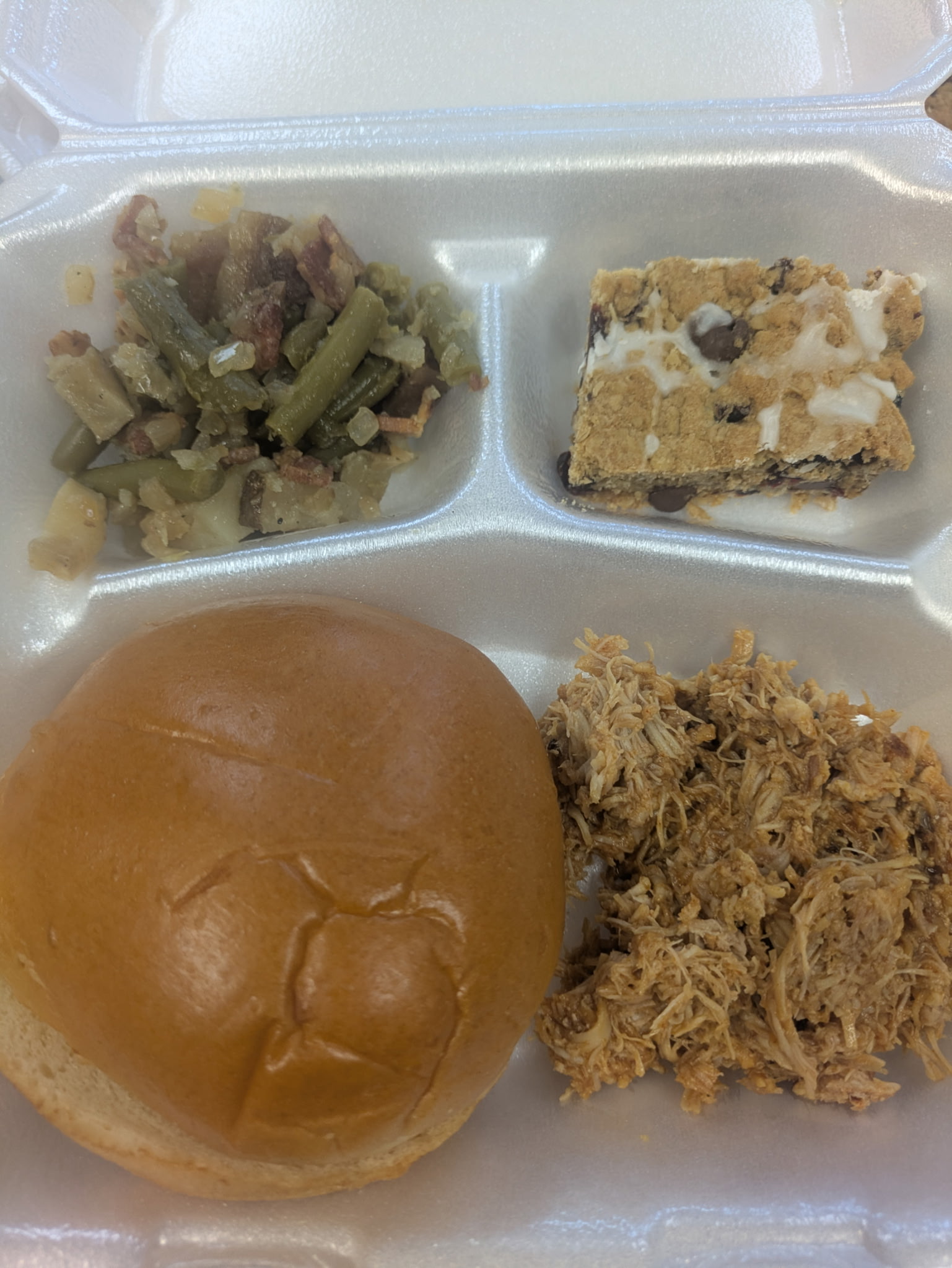 BBQ pork, beans, coleslaw, roll and homemade brownie