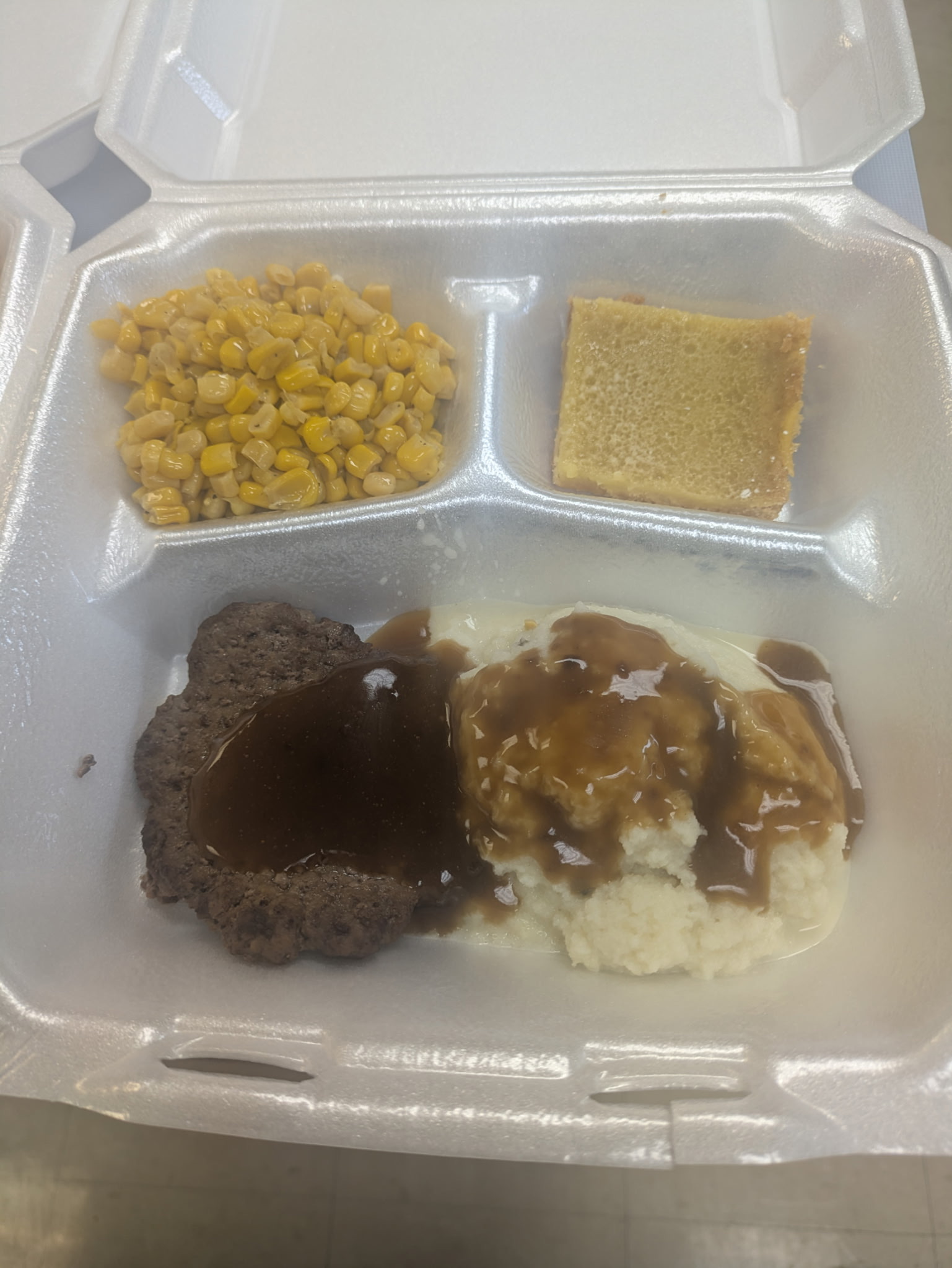 Salisbury steak, mashed potatoes with brown gravy, corn and orange bars