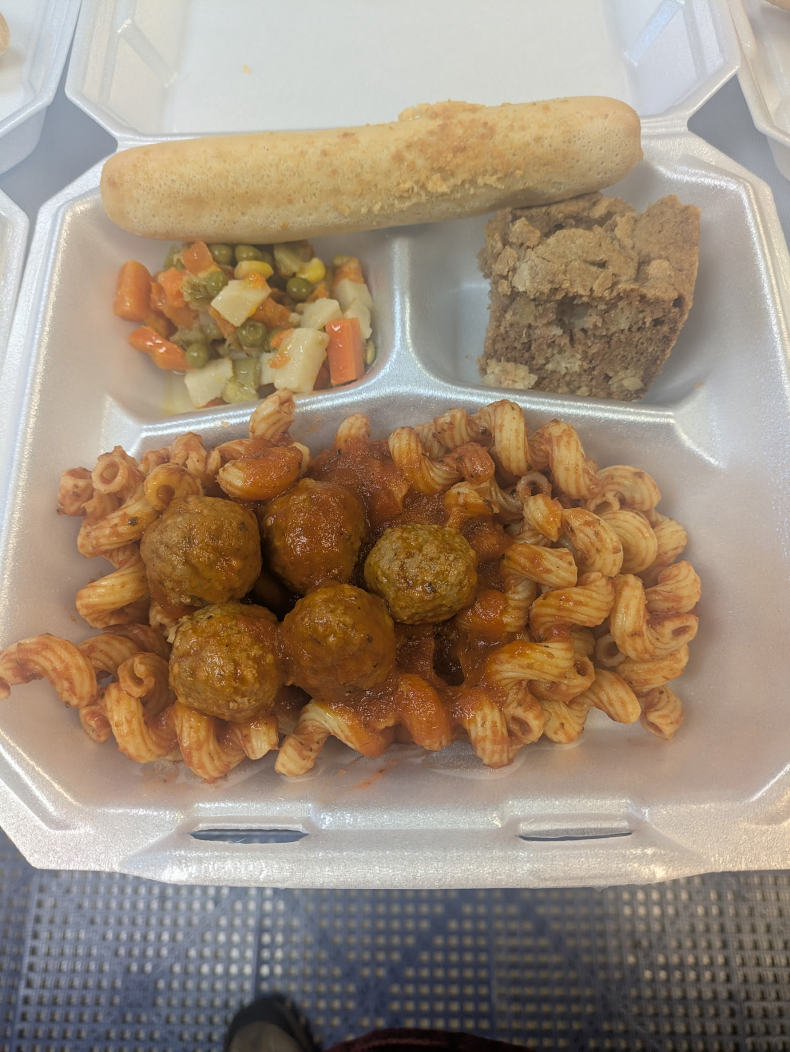 Cavatappi with meatballs & sauce, mixed vegetables, breadstick, and homemade apple bread