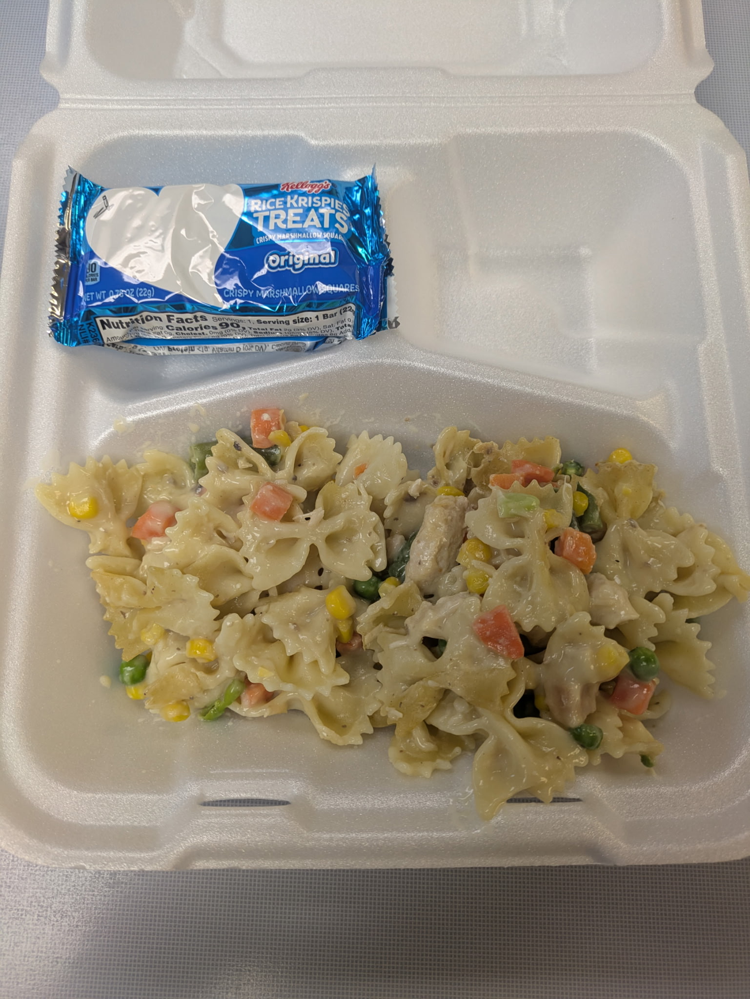 Chicken strips with alfredo rotini, mixed vegetables, brownie, chocolate chip cookies, popcorn, and soda.