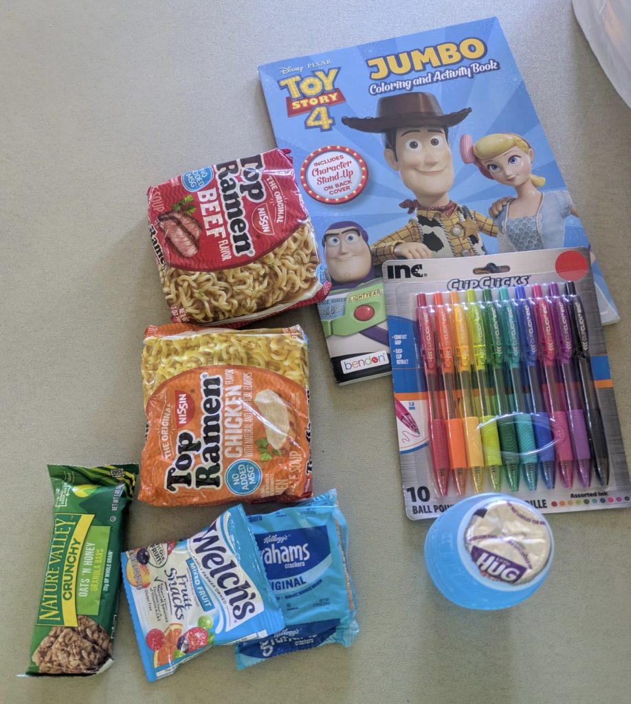 Pasta salad (salami, colby jack cheese, tomatoes, Italian dressing), chips, homemade cookies, and a drink
