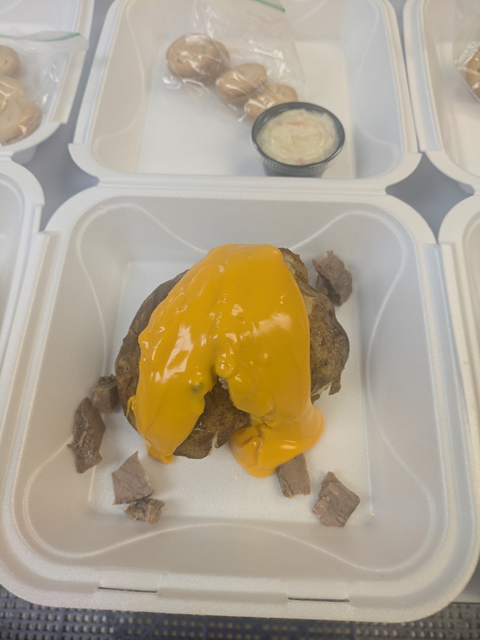 Jumbo Potato with Butter, Cheddar Cheese, Sauce and Roast Beef Chunks, coleslaw and cookie
