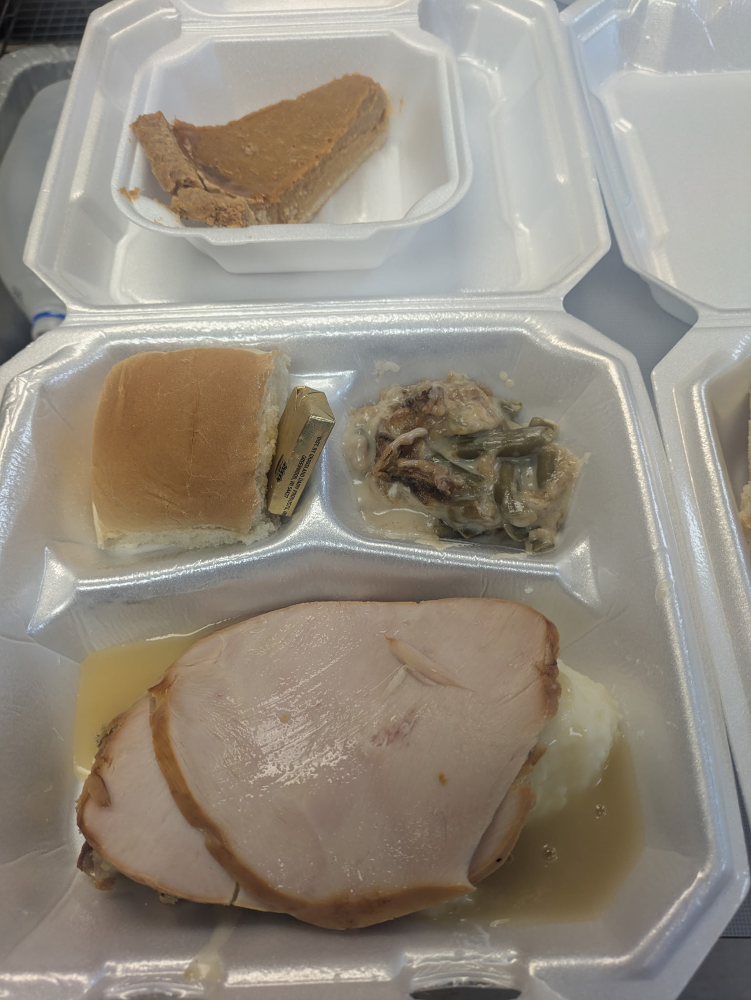 Turkey, mashed potatoes, stuffing, roll, green bean casserole and pumpkin pie